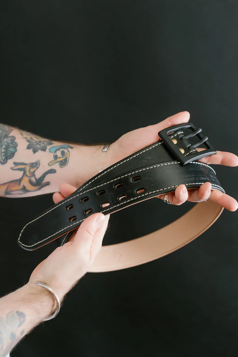This stunning, heavyweight belt is crafted from thick, hand-painted British bridle leather, stitched with robust 0-count thread to withstand whatever you throw at it. Using a traditional method perfected by skilled artisans in the UK, the bridle leather is laminated with premium, domestically-tanned leather, creating an impressive 6mm thickness that’s practically armor. Right from the start, you'll notice a beautiful white bloom on the leather’s surface, a sign of true bridle craftsmanship. Over time, this bloom melts into the leather, revealing a rich, tea-core patina as the natural tones start to shine through the top layer. This belt will only get better with age, growing in depth and character with each wear, making it a statement piece that’s as enduring as it is striking.