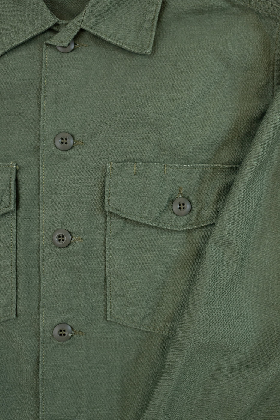 If you can't tell by now, we love fatigue shirts. This one is very easily our favorite. It's a beautiful, horizontally-textured reverse sateen with the buttons that are so familiar to all of us, yet so hard to describe. It's almost like they've taken all of the shiny stuff of urea buttons and what you're left with is this texturally satisfying almost rubber-like hand feel. That's enough about buttons, though. This double chest pocket fatigue is perfectly simple with all the right tags and details in all the right places. It's been quite a while since we had the original. We sell out and then spend months waiting for it to grace our shelves again. It's the OG and that makes it really hard to beat.Â