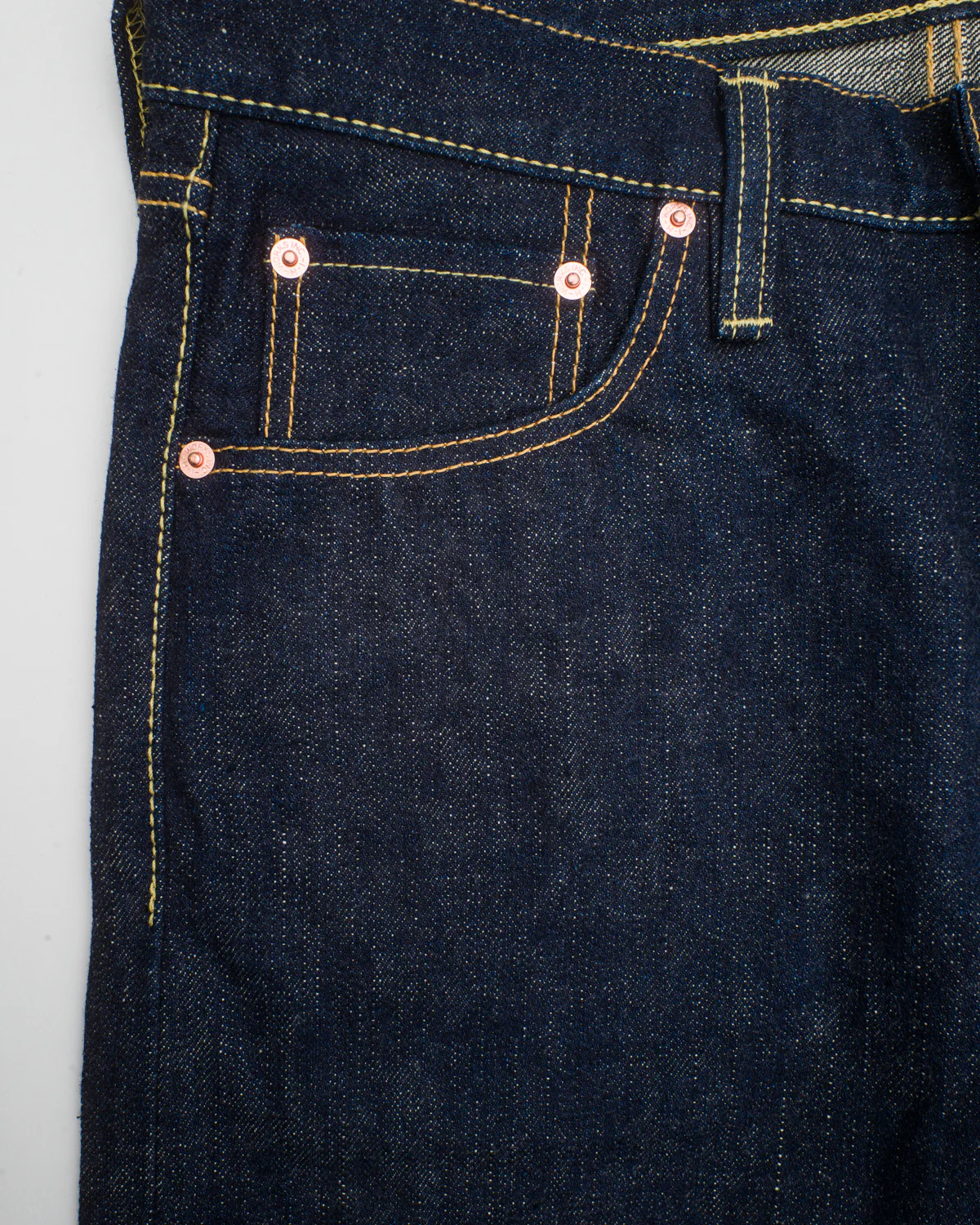 - 18oz rope dyed indigo warp, natural weft Japanese selvedge denim