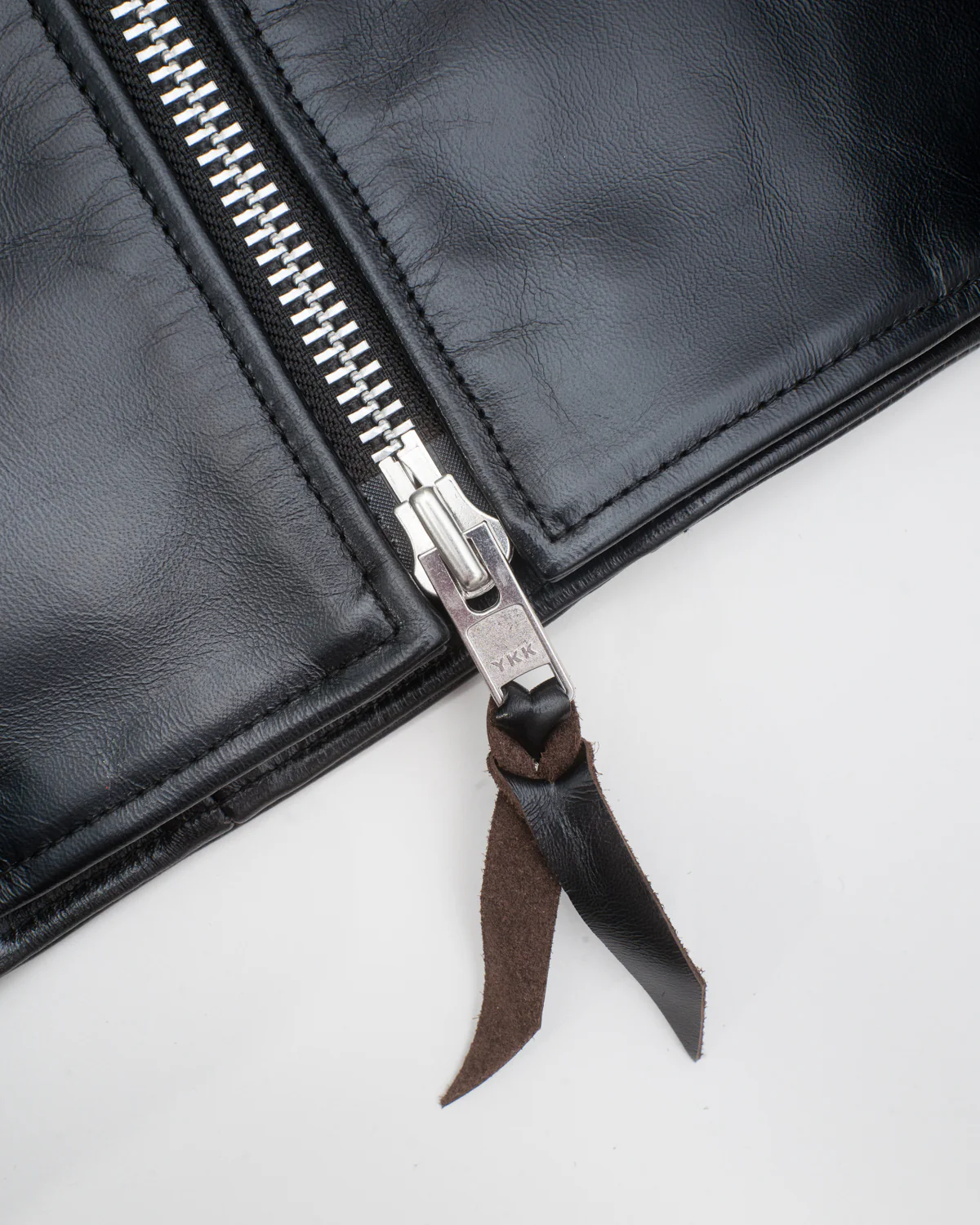 Well, if we were going to get into leathers from Iron Heart, we were always going to start with a bang. This absolutely gobsmackingly good leather rider's jacket has the kind of translucent shine you really only get from horsehide. This beauty is a black tea-core dye, meaning that as you wear it and that shine fades a bit, you'll start to see the natural browns of the leather poke through. We've seen this effect before, and trust us, it's mesmerizing. It's the type of antiquing everyone wants, but you can only get from the right kinds of leather. That all starts with this super soft chrome tanned horsehide from Himeji, the tanning capital of Japan. All the finishing touches that make this jacket iconic "Iron Heart" quality are listed below. The real story starts a few wears down the road when this thing starts to age to perfection.