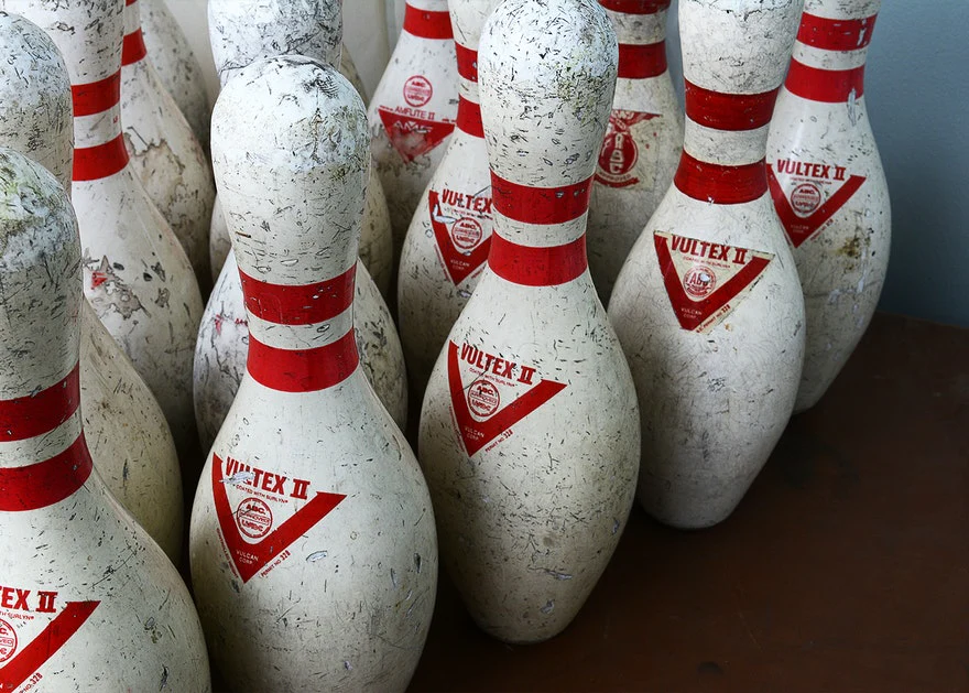 A grouping of twenty Vultex II bowling pins split individually to be used as decor. Love The Big Lebowski? This is your chance to show that love in your home. Each Surlyn coated white pin has two red bands at the neck and is marked with the signature Vultex maker’s mark. These things are used to perfection.Â