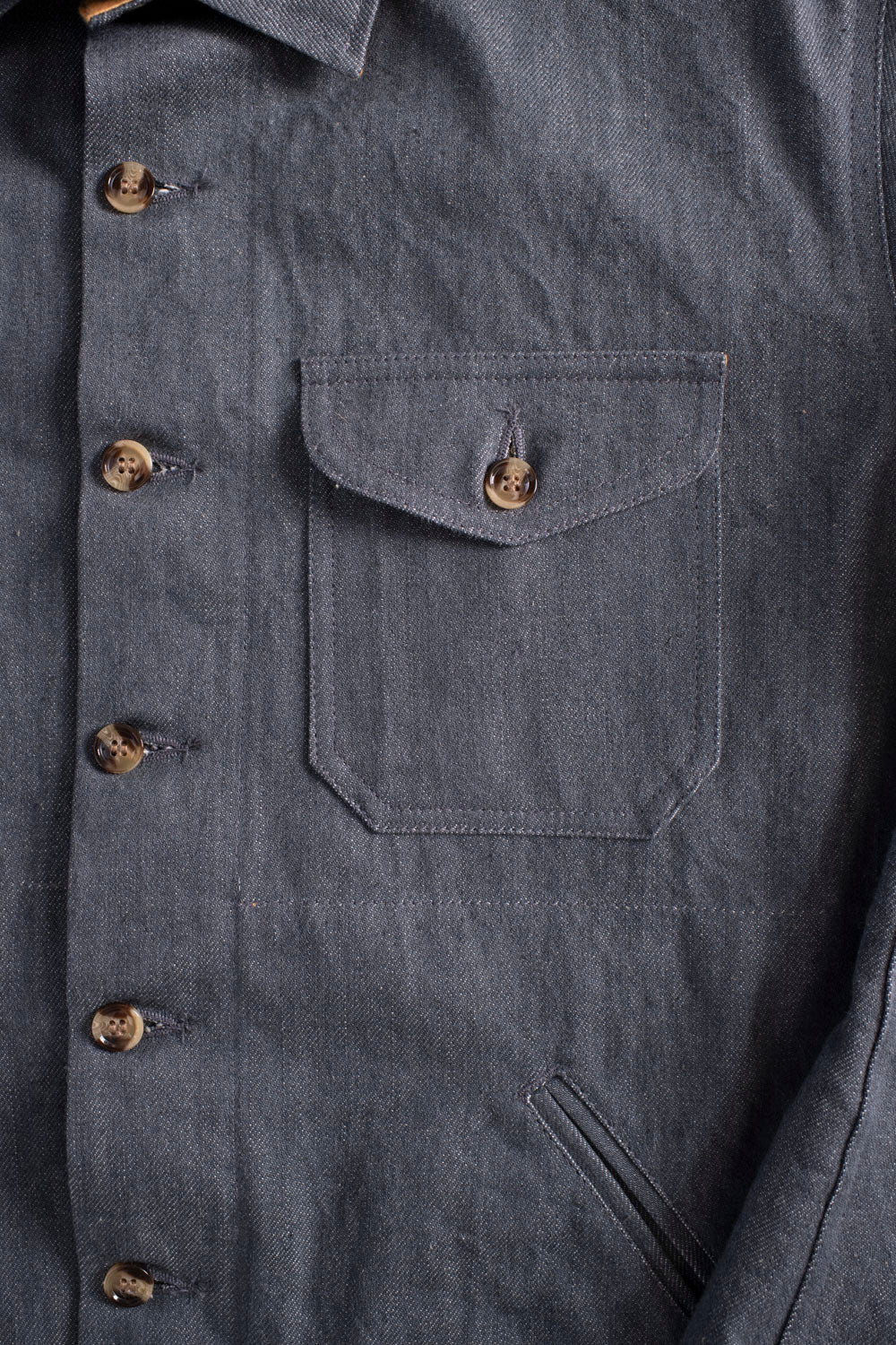 The first fabric you see here is a 12.5oz Kuroki Mills blue line selvedge from Japan. This color plays somewhere between grey and blue, so we decided to call it pewter. It's the heavier of the two fabrics, but as we mentioned...we've sent this to a wash house to give it a one-rinse, or Tempi treatment to make it easy to wear out of the gate. It also brings a lot of neppy, hairy texture to the surface fo the fabric. We still consider these garments to be raw meaning they will fade and age to perfection. We stuck with tonal stitching to completely highlight that pewter color and slapped on as many tortoise buttons as we could fit. The finisher on this garment is the handwarmer pockets making it a wonderful blend between a shirt and jacket.