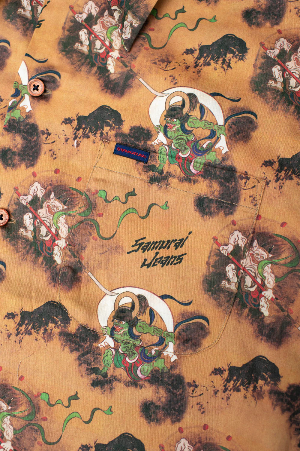 When we saw this fabric used as a fabric liner, we were over the moon excited. But we couldn't help but think...this fabric will only ever be seen by the wearer - which is fine. But, a little (maybe large) part of us wanted to see this fabric used for something else. We were stunned when we saw it turned into an Aloha shirt, and they honestly couldn't have chosen a better silhouette to represent it. The two figures depicted on the shirt are the gods of "Wind" and "Thunder." It's a gorgeous, smooth sateen fabric that feels so nice against the skin. Theres just the right amount of Samurai branding and all that construction detail you're used to.