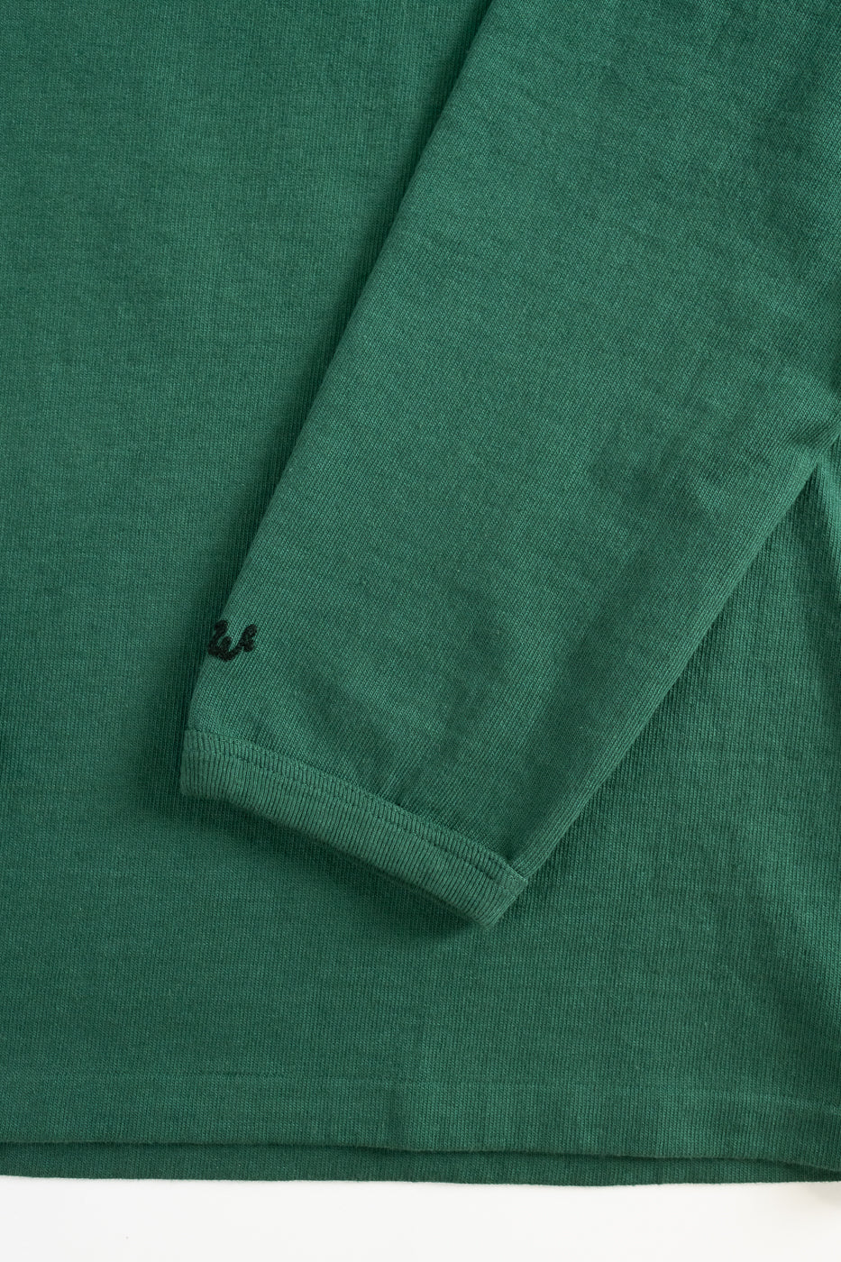 We love the utility of a long-sleeved shirt. Whether for a layer of comfort under a wool CPO or a way to upgrade your standard tee, these "Stand Wheel" shirts are a wonderful option. Typically, a heavyweight shirt is stiff and more difficult to wear, but the stand-wheeler machine creates a loosely woven, softer fabric. They've also taken the additional step of binding the cuffs and hem instead of sewing them on. This significantly increases the life of the ribs. They've polished this piece with a pretty little chainstitch style DW on the sleeve.